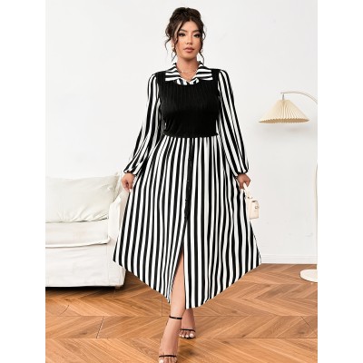 Plus Size - Plus Size - Elegant Plus Size Striped Dress for Women - Black & White Vertical Stripes